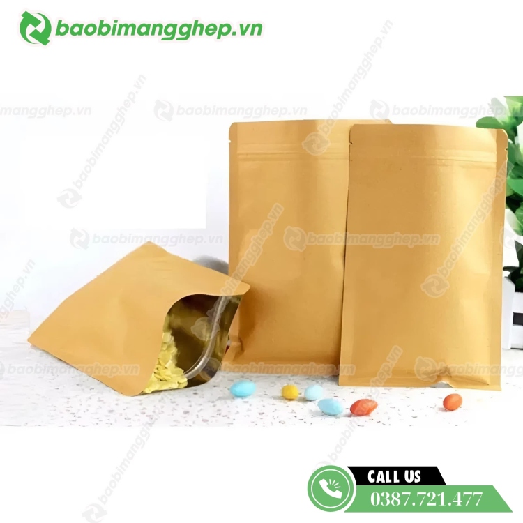 Túi 3 biên giấy kraft — kết hợp lớp ngoài là giấy kraft nâu tự nhiên với các lớp màng trong bảo quản. Túi mang phong cách thủ công, organic, rất được ưa chuộng trong phân khúc thực phẩm sạch, hữu cơ, trà thảo mộc, cà phê, nông sản cao cấp.